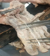 Figure 1: Flexor Digitorum Brevis (FDB) of right Foot showing three parts from its distal end. From 1st part only a fascia arises. From 2nd and 3rd part tendon arise for the 3rd and 4th toe.