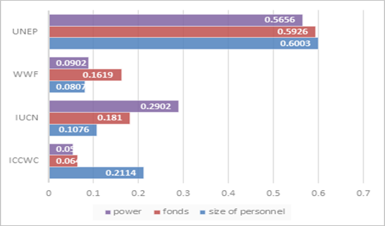 Based on the combination of staff size, funding, and power, this paper analyzed the multi-attribute decision models of four organizations this paper were interested in, such as UNEP. The judgment matrix and consistency ratio (CR) of the analytic hierarchy process (AHP) are used to evaluate the rationality of weights: