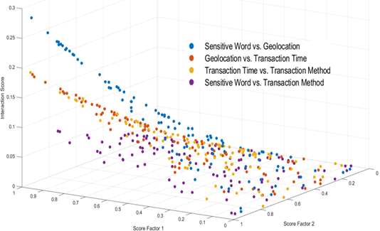 This paper then constructs a stochastic forest model using these features as inputs. Then, this paper uses the trained stochastic forest model to predict the new trading data and get the risk evaluation value. Next, this paper can use the 'scatter 3' function to plot a three-dimensional scatter plot between sensitive word scores, geographic location scores, trading time scores, and trading mode scores, but this time this paper will use the predictions of the stochastic forest model as color coding. Indicates the level of risk. The results are shown in Figure 3.