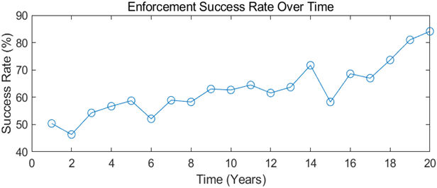 In addition, this paper predicts an increase in the success rate of enforcement. After the implementation of the project, due to the application of a data-driven decision support system, law enforcement departments can more accurately locate and combat illegal transactions, and the success rate of law enforcement is expected to increase from the current 40percent to more than 60percent . This will significantly enhance the deterrence of illegal trading and reduce the likelihood of criminals taking chances. The results are shown in Figure 8.