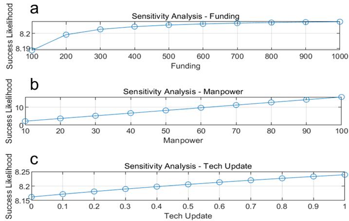 Figure 9: Sensitivity analysis of different indicators. (a) Funding; (b)Manpower; (c)Tech Update.