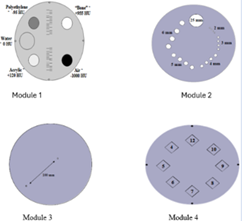 All image quality evaluations were conducted using the ACR Gammex 464 phantom, constructed from solid water-equivalent material. This cylindrical phantom is 20 cm in diameter by 16 cm in length. The ACR CT accreditation phantom consists of four modules designed to evaluate key image quality parameters. Module 1 assesses positioning and alignment, CT number accuracy, and slice thickness, featuring 1-mm steel BBs placed at 3, 6, 9, and 12 o’clock positions (19.9 cm apart), material cylinders representing bone, polyethylene, water, acrylic, and air for CT number accuracy evaluation as well as 0.5-mm ramp wires for slice thickness determination. Module 2 evaluates low-contrast resolution using cylinders of 2–6 mm diameters with 0.6% contrast against a ~90 HU background, along with a 25-mm cylinder to determine the contrast-to-noise ratio. Module 3 comprises a uniform tissue-equivalent material to assess CT number uniformity and includes 0.28-mm BBs for in-plane measurement accuracy and section sensitivity profile assessment. Module 4 measures high-contrast (spatial) resolution with bar patterns ranging from 4 to 12-line pairs per centimeter (lp/cm) within 15 × 15 mm areas, 3.8 cm in depth, and also contains four 1-mm steel beads for positional reference. ACR 2022 contains a detailed description and composition of the design. fig 1 shows each module's schematic representation, as provided by ACR 2022.