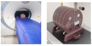 Figure 2: Pictures showing the position of the phantom at the CT gantry