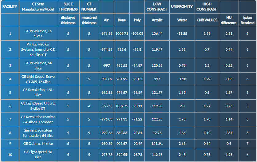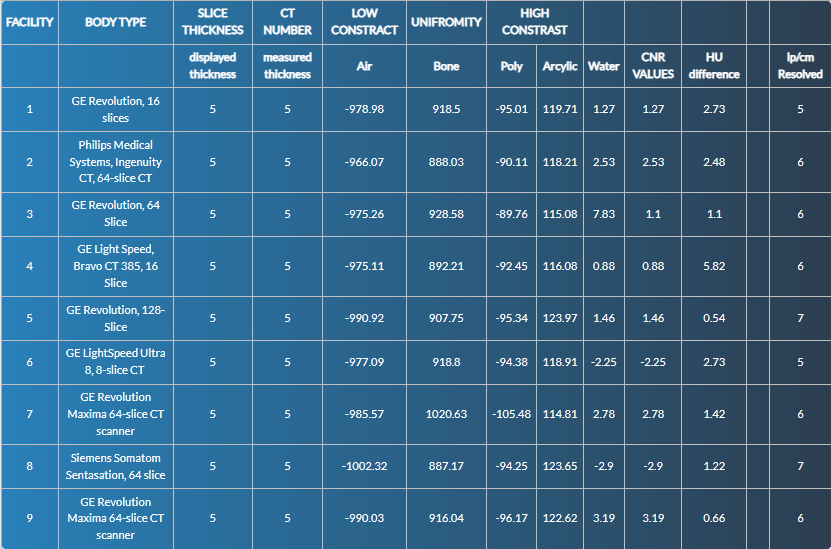 The raw data obtained from the phantom measurements are provided in tabular format, processed to derive meaningful statistics and compared to ACR 2022 acceptance criteria. Descriptive statistics were used to summarize performance across all facilities. Compliance rates were determined for each image quality metric, and scanners falling outside ACR thresholds were noted.