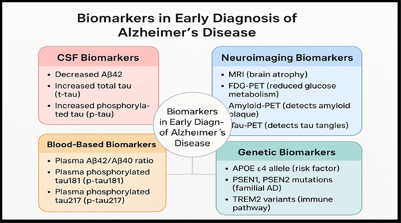 Biomarkers play an indispensable role in the early diagnosis and management of Alzheimer’s disease. While CSF and imaging markers are well-established, recent advances in blood-based and genetic biomarkers offer hope for less invasive, accessible, and cost-effective diagnosis. Continued research and validation are essential to integrate these tools into routine clinical practice and enable timely intervention. In conclusion, while significant strides have been made, the journey toward universal, accessible, and reliable biomarker-based diagnosis of AD continues. Bridging the gap between research and routine practice will be essential for transforming Alzheimer’s care.