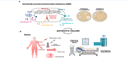 Figure 1: Factors contributing to antibiotic failure: AAntimicrobial resistance driven by genetic exchange or mutation, leading to evolving resistance, and (B) sepsis, a severe response to infection, intensifying the urgency for effective treatment.