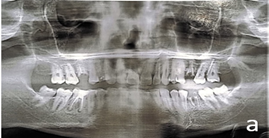 Although chairside examination was restricted, the patient permitted an OPG radiograph shown in Figure 1a , which revealed pathology involving all four first molars. Findings included:
