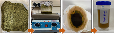 To get rid of dirt and debris, leaves of Pongamia pinnata were washed and shade dried, and after drying, converted to powdered form. 50 g of finely powdered leaves were carefully mixed in 1:1 of methanol and MilliQ water to boil for extract preparation. The first Whatman filter paper was used to filter the cooled extract. The filtrate was gathered and kept cold (4°C) until it was needed again (Figure 1).