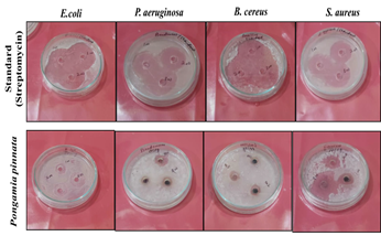 A fairly common plant in India is Pongamia pinnata, which belongs to the Fabaceae family. Pongamia pinnata is referred to as Indian beech in English, kanuga in Telugu, and Karanja in Hindi. From a botanical standpoint, the nomenclature of genera can be particularly complex because multiple species from various genera might be used interchangeably [18]. Seeds of the plant have been used to produce pinnatin, pongapin, kanjone, pongagalabrone, and karangin. The stem and leaves of the plant include flavones and chalcone derivatives such as Pongagallone A and B, Galbone, Pongone, and Pongalbol. Pongamia pinnata fruits include three new pongamosides, A–C, which are furnoflavanoid and glucosides, and pongamoside D, a unique flavanol glucoside. The Pongamia pinnata root extract contains anticancer medications such as etoposide, paclitaxel, fluorophenylalanine, vinblastin, and vincristine (sulfate) [19]. In conventional medical systems, nearly every element of this plant is utilized as a blood purifier, antiseptic, and wound healer. The plant Pongamia pinnata is a medicinal plant that has been used in Ayurvedic and Unani medicine systems for its anti-inflammatory, antiplasmodial, antinociceptive, antihyperglycemic, anti-lipid peroxidative, antidiarrheal, antiulcer, antihyperammonaemic, antioxidant, and antibacterial properties [20]. A redox imbalance brought on by an excess of ROS (Reactive Oxygen Species) production leads to the production of several inflammatory compounds [21]. A significant amount of research has shown the worrying rise in multidrug-resistant bacteria, which highlights the evolution of antibiotic resistance among pathogens as a growing worldwide health risk [22]. In many regions of the world, Natural medicinal plant items have been utilized for many years as invaluable treatments for a wide range of illnesses since they are readily available and reasonably priced [23]. It has been observed by Khan and Mali (2017) that several medicinal plants have antibacterial action in addition to other pharmacological qualities [24]. Antibiotic usage has completely changed how many different bacterial infections are treated. However, the widespread use of these drugs has resulted in an alarming rise in antibiotic resistance in microbes; the discovery of novel antimicrobials is necessary [25]. Pongamia pinnata has numerous traditional uses that have inspired researchers to examine its pharmacological characteristics and confirm the uses of this species as a treatment [26]. The leaf chloroform fraction of Pongamia pinnata showed enhanced antibacterial activity against Pseudomonas aeruginosa, Staphylococcus aureus, and E. coli. When it came to inhibiting P. aeruginosa and E. coli, the acetone part worked better than normal. The petroleum ether fraction did not significantly inhibit microorganisms as compared to the reference [27].