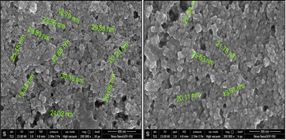 Through SEM, the morphology of the green-synthesized AgNPs was analyzed. According to SEM measurements, AgNPs of Pongamia pinnata are between 25 to 50 nm in size. (Figure 4).