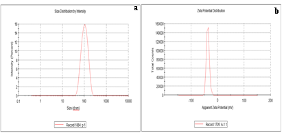 Figure 3: 3a DLS analysis of AgNPs of Pongamia pinnata with an average hydrodynamic diameter of 108±9.5 nm & 3b shows Zeta Potential results of AgNPs synthesized from methanolic leaf extract of Pongamia pinnata at -36.5 mV.