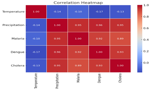 Correlation Heatmap: A visual representation of correlation coefficients for temperature and precipitation with disease incidence.