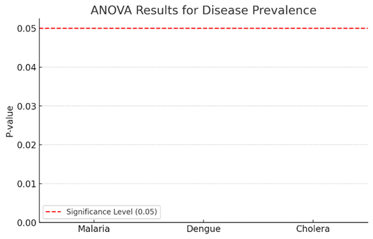 ANOVA Test Results: p-values: Less than 0.05 indicate strong relationship between variables: Malaria Temperature: p = 0.0006 strong relationship, Rainfall: p = 0.0020 strong relationship, Dengue Fever Temperature: p = 0.000016 Very strong relationship, Rainfall: p = 0.0022 strong relationship and Cholera Temperature: p = 0.00006 Strong relationship, Rainfall: p = 0.0112 Less strong relationship.
