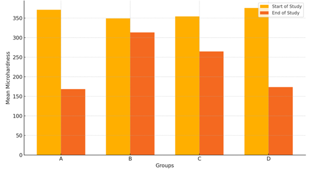 This table provides detailed information, including mean, standard deviation, and the range of values (minimum and maximum), for each group, allowing for a comprehensive comparison across conditions. Moreover, to visually highlight the comparative differences in mean microhardness values between the start and end of the study, a bar chart (Figure 1) is also included.
