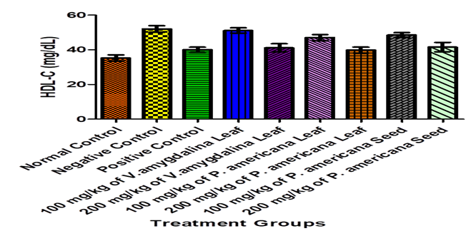 The triglyceride profile showed a sharp increase in the negative control group (223.20 mg/dL), significantly higher than the normal control (120.85 mg/dL), affirming previous observations that preeclampsia is often characterized by hypertriglyceridemia [23]. Treatment with both plant extracts significantly attenuated this elevation. The most notable reductions were recorded in the 200 mg/kg V. amygdalina group (166.37 mg/dL) and the 200 mg/kg P. americana leaf group (127.19 mg/dL), the latter closely approximating the normal triglyceride level. These findings are supported by the work of Nwangwa et al. [24], who reported that V. amygdalina significantly reduced serum triglyceride levels in diabetic rats. This may be due to its inhibitory effects on hepatic lipogenesis and promotion of peripheral lipid metabolism. Likewise, studies by Lu et al. [25] highlighted the triglyceride-lowering properties of avocado due to its oleic acid content and fiber, which enhance lipid metabolism and reduce hepatic triglyceride synthesis.