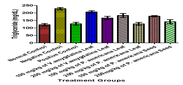 LPS exposure significantly increased total cholesterol in the negative control group (213.50 mg/dL) compared to the normal control (142.02 mg/dL). Treatment with V. amygdalina and P. americana reduced cholesterol levels, with the most notable reductions observed in the 200 mg/kg P. americana leaf group (156.86 mg/dL) and the 200 mg/kg seed group (161.46 mg/dL), approaching the level of the positive control (158.93 mg/dL) (Figure 1). The negative control group showed an elevated HDL level (52.00 mg/dL) compared to the normal control (35.32 mg/dL). Among treatments, V. amygdalina at 100 mg/kg (51.14 mg/dL) and P. americana seed at 100 mg/kg (48.52 mg/dL) showed higher HDL values (Figure 2). Triglyceride levels were markedly elevated in the negative control group (223.20 mg/dL) versus the normal control (120.85 mg/dL). Treatment reduced these levels substantially, especially with 100 mg/kg P. americana leaf (127.19 mg/dL) and 200 mg/kg V. amygdalina leaf (166.37 mg/dL), nearing the positive control level (127.56 mg/dL) (Figure 3).