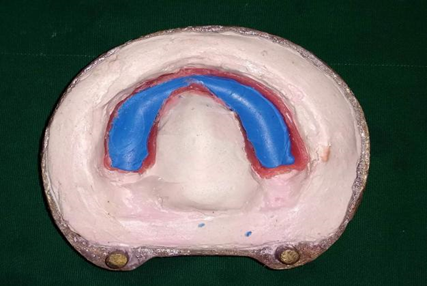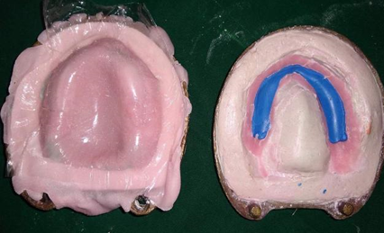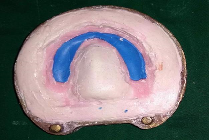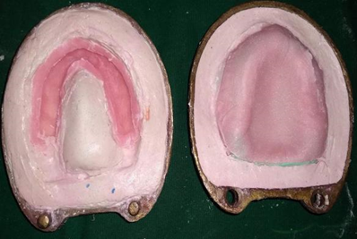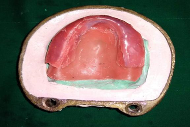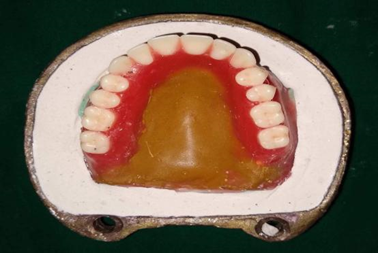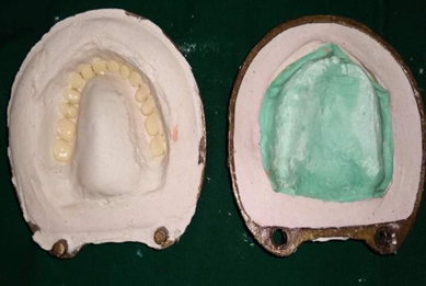 Conventional steps for denture fabrication were followed. After the teeth setting trial was satisfactory, the dentures were sealed to the definitive cast. The casts were invested in the flask followed by de-waxing it in a conventional manner (Figure 1,2). layer of base plate wax (Hindustan modelling wax, Hyderabad, India) was adapted on the counter flask over the teeth portion of the denture up to a level where it touches the maxillary cast on the base flask. The thickness of the adapted wax was measured using a periodontal probe to ensure adequate depth. Stoppers was carved on the 2nd premolar and 1st molar regions on the adapted wax. Correspondingly, a layer of wax was adapted over the maxillary cast on the base flask, which would be replaced by a heat-cured acrylic resin denture base.