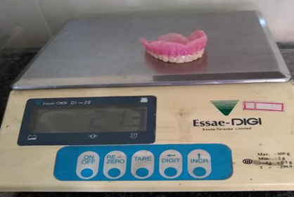 The main advantage of this technique is that it is a single stage procedure and single flask involved with no additional step, there is no line of demarcation in the prosthesis and no need to create opening in the prosthesis to recover the putty. Weight reduction was evaluated by duplicating the prosthesis in auto polymerizing resin [14] there was a significant weight difference between them (Figure 8) (8a-Hollow denture -21.3 grams, 8b-Duplicated denture - 27.8 grams). A denture float test was performed to verify the hollowness of prosthesis [9] (Figure 9).