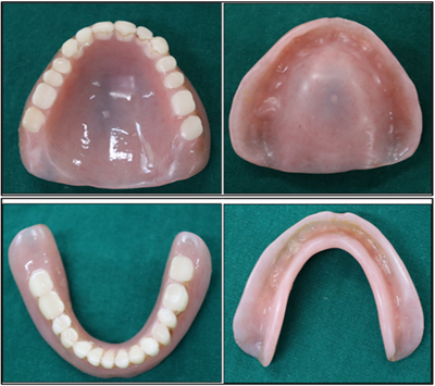 The master casts were fabricated and maxillomandibular relations were established. A trial denture was arranged with zero-degree acrylic teeth to provide monoplane occlusion. The final dentures were processed, finished and delivered, with detailed patient education on use, care and maintenance, followed by scheduled reviews.