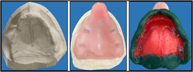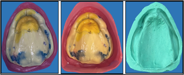 Upper Primary impression was made using Alginate in perforated edentulous tray and primary cast was poured followed by custom tray fabrication incorporating a double spacer (1.5 mm thickness) over the flabby tissue and in the region of mid palatine raphe (0.3 mm spacer). Border molding was done using with green stick impression compound. Space wax was removed and the impression was made with PVS material. The tray was then removed from the mouth and impression material was removed in the region of flabby tissue using a scalpel. Relief holes were made in the tray and the tray was loaded in the region with light body elastomeric impression material to record flabby tissue. A master cast was poured from the impression by beading and boxing.