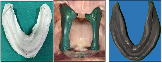 The primary cast was made using previous denture with alginate. The custom tray is fabricated using auto polymerizing acrylic resin. The special tray is made with 1mm spacer and cylindrical mandibular rest in posterior region are made at increased vertical height. High-fusing green stick compound was softened and placed on top of the mandibular rest and inserted in the patient’s mouth. The patient was advised to close her mouth. Adjustments were made so that the mandibular rest fit against the maxillary alveolar ridge properly. For final impression the wax spacer was removed, the impression compound and green stick compound in a 3:7 ratio was placed in water