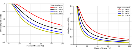 Room ventilation: For the high efficacy mask the probability of being infected with SARS-CoV-2 was 0.450 in a room with 1 air change/hour (ACH), 0.260 at 2 ACH, 0.095 at 6 ACH, and 0.046 at 12 ACH (Figures 2a, and 2b). For the low efficacy mask, the probability of acquiring SARS-CoV-2 infection was 0.761 at 1 ACH, 0.509 at 2 ACH, 0.211 at 6 ACH, and 0.111 at 12 ACH.