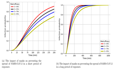 Figure 4: The model simulation shows the impact of masks on preventing the spread of SARS-CoV-2 in short and long period of exposure.