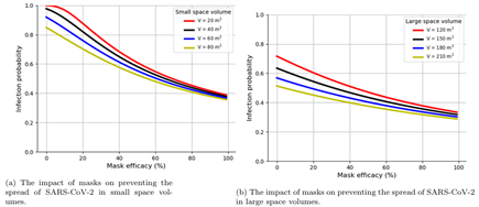 Figure 3: Model simulation showing the impact of masks on preventing SARS-CoV-2 transmission in small and large space settings.
