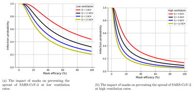 Figure 2: Model simulation showing the impact of masks on preventing SARS-CoV-2 transmission at low and high ventilation rate settings.