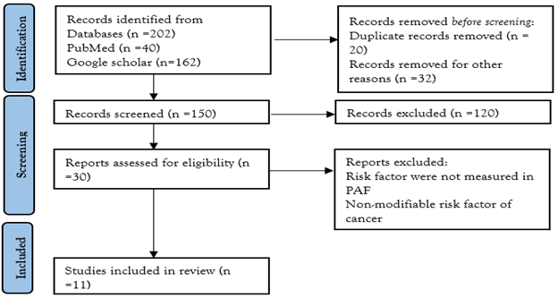 Method: Using the electronic databases Google Scholar and PubMed, a comprehensive systematic literature search was conducted between 2010 and 2024. Articles and abstracts published in English were searched. Articles addressing modifiable cancer risk factors and their association with cancer were included. In the meta-analysis, 11 studies met the inclusion criteria after screening the initial set of retrieved articles. Data from these studies were extracted and synthesized to evaluate the association between modifiable risk factors and cancer outcomes.