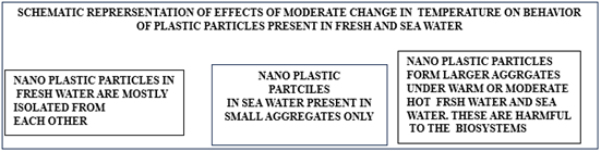 Since, plastic polymers are made of long chains of repeating molecular constituents [units], the process of their transition of their solid form to liquid form is a gradual process. This is because the conformational chains disentangle in a gradual manner [19, 20, 21]. Although, the range of melting points of some of the common plastics is the bases of their utility but it can also reflect on their temperature tolerance limits [thermolabile nature] range. The aqueous medium containg plastics can be subjected to boiling (standard boiling point of water is 100°C). Moderately, it is a safe mode to isolate the plastics particles from the test sample and rendering water pure around 99.9%. One can expect that double distilled water is also devoid of plastics but small fraction of plastic particles remains in it. Rise in temperature on water containg plastic results in their aggregation. Generally, with rise in temperature the degree of aggregation increases (possibly change in their surface electrical charge cohesion ability increases). The aggregates of plastics cause physiological interference in the marine and fresh water organisms more specifically in of warmer waters (ocean current of warm water) [22].