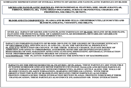 The micro and nano plastic particles influence the physicorheological parameters of blood. The effects of these particles depend on their size, type, concentration, exposure duration and the surface physicochemical features of the plastic particles. Primarily, disturbed dynamics of clotting process, viscosity of blood and adhesion among erythrocytes are common in the test models in vitro. and test models. These plastic particles affect the shear stress and shear rate that causes fluctuations in viscosity and consequently ESR, blood flow undergo fluctuations. Overall view on the impacts of micro and nano plastic particles is quite fluctuating. The effects vary with the type of plastic particles as these particles exhibit different range of impacts. Polystyrene particles adhere to the surface of erythrocytes, enhance the degree of adhesion with endothelial cells of blood vessels. These minute physical hurdles interrupt the flow and viscosity too. The aggregated erythrocytes enhancing the viscosity, this effect is more prominent in the blood vessels in which the flow-rate is slow or blood vessels are narrow. The surface properties of erythrocytes and micro and nano plastic particles destabilize the erythrocytes membrane and degree of their aggregation. These new developments affect ESR, flow and blood viscosity. These parameters are more effective in the blood vessels having low shear rates. These micro and nano plastic particles induce aggregation and facilitate cascade of clotting process and cause decline in the flow of blood. Thus, micro and nano plastic particles are agents to induce the cardiovascular complications [70, 71].