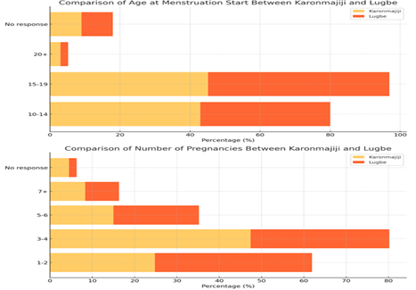 The onset of menstruation among respondents in both Karonmajiji and Lugbe aligns with broader findings on reproductive health, where menarche typically occurs between the ages of 10 and 19. In Karonmajiji, 42.9% of respondents reported each. Additionally, 9.0% of respondents in Karonmajiji and 8.9% in Lugbe did not experience menarche between ages 10 and 14, while 45.1% started menstruating between ages 15-19. Similarly, in Lugbe, 37.1% experienced menarche between ages 10-14, and 51.8 percentage between the ages 15-19. The literature suggests that early menarche can influence reproductive behaviour, including the timing of first pregnancies and contraceptive use (MaeregayehuTibo et al., 2021). Studies on postpartum contraceptive use indicate that age at menarche may have long-term implications for reproductive health and decision-making about family planning, as younger menarche is often associated with earlier childbearing and an increased need for contraception, reinforcing the need for targeted reproductive health education (Abera et al., 2015). The number of pregnancies reported in Karonmajiji and Lugbe reveals variations in reproductive behaviour between the two locations, with most women experiencing 1-4 pregnancies. In Karonmajiji, 24.8% of respondents reported having 1-2 pregnancies, while 47.4% had 3-4 pregnancies. Comparatively, in Lugbe, 37.1% had 1-2 pregnancies, and 32.8% had 3-4 pregnancies. Additionally, 15.0% of respondents in Karonmajiji and 20.2% in Lugbe reported having had 5-6 pregnancies, while 8.3% in Karonmajiji and 8.0% in Lugbe had experienced 7 or more pregnancies. A small percentage did not report their pregnancy history (4.5% in Karonmajiji and 1.8% in Lugbe). These findings align with studies highlighting the influence of fertility preferences, contraceptive access, and social norms on reproductive outcomes (Jalang’o et al., 2017). The higher percentage of respondents in Lugbe with fewer pregnancies compared to Karonmajiji suggests possible differences in contraceptive uptake and spacing behaviour. The presence of women with five or more pregnancies in both locations reflects patterns observed in studies on contraceptive non-use or discontinuation, where family planning needs and sociocultural influences contribute to high fertility rates (Dev et al., 2019; Mukanga et al., 2023).
