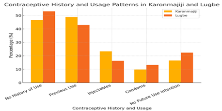 The study reveals differences in the contraceptive history of respondents in Karonmajiji and Lugbe, which aligns with the study’s objective of analysing demographic influences on contraceptive behaviour. A slightly higher proportion of women in Lugbe (53.1%) reported no history of contraceptive use compared to Karonmajiji (46.6%). However, 48.9% of respondents in Karonmajiji and 42.9% in Lugbe had previously used contraceptives, indicating some level of acceptance in both locations. Injectable contraception was the most commonly used method in both communities, with 23.3% of respondents in Karonmajiji and 16.3% in Lugbe reporting usage. Condom use was also notable, with 9.8% in Karonmajiji and 13.2% in Lugbe indicating prior use, alongside lower but relevant figures for implants and oral contraceptives. Indicating similar trends in the literature (Abate & Obsie, 2021; Assefa & Koboto, 2021; Seifu et al., 2020). However, a significant proportion of women in both locations (16.5% in Karonmajiji and 22.4% in Lugbe) expressed no intention to use contraception, which suggests potential cultural or informational barriers requiring targeted interventions.