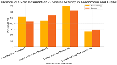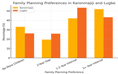 As presented in the charts above, the timing of the next child and the spacing between pregnancies are crucial aspects of family planning, reflecting broader patterns of postpartum contraceptive use and reproductive decision-making. In Karonmajiji, 33.1% of respondents preferred not to have additional children, compared to 26.1% in Lugbe, indicating a significant interest in family size limitation. Among those planning for another child, the most common preference was a two-year gap, with 25.8% in Lugbe and 19.5% in Karonmajiji opting for this interval. However, in Lugbe, the majority (53.4%) reported pregnancy intervals of 1-2 years, while in Karonmajiji, 42.1% preferred a longer spacing of three years or more, suggesting a potential trend toward extended birth intervals. These findings align with studies such as Abera et al. (2015) and Dev et al. (2019), which highlight the strong influence of postpartum contraceptive use on birth spacing and reproductive choices. Additionally, menstrual cycle resumption post-delivery serves as an important indicator of postpartum reproductive readiness, with 51.9% of women in Karonmajiji and 43.3% in Lugbe reporting the return of menstruation. Correspondingly, 45.1% and 54.3%, respectively, had not resumed their cycles, reinforcing the link between physiological recovery and contraceptive decisions to (Naigino et al., 2021).