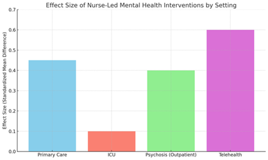 Here is a graph showing the effect sizes (standardized mean differences) of nurse-led mental health interventions across different clinical settings. It illustrates that telehealth and primary care interventions tend to have higher effect sizes, while ICU-based interventions show relatively limited impact on long-term mental health outcomes.
