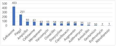 Antibiotics that were prescribed the most were cephalosporins 520(41%) including ceftriaxone 433 (34.6%) and cefotaxime 87(6.9%); Nitroimidazoles prescribed in Flagyl name 251(20%) and penicillin (16%) (Figure 2).