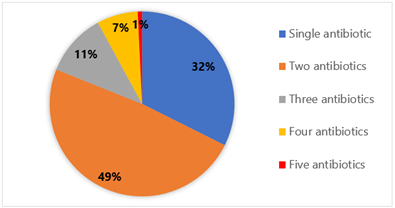 For 655 inpatients, antibiotics were prescribed 1265 times. The average number of antibiotics prescribed per patient was 1.95, with SD of ± 0.888 of the total antibiotics; 80% of antibiotics were prescribed from the Rwanda essential medicine list and written by generic names (Table 2). On the other hand, most of the antibiotics were written in injection form (83%). Out of 1463 inpatients in the hospital, 44.76% received at least one antibiotic, Additionally, approximately 49% of these patients were prescribed two antibiotics, with some receiving as many as four or five different antibiotics, 7% and 1% respectively (Table 2, Figure 1). The adherence to STGs and laboratory results was 62% and 23.2%, respectively. Furthermore, the availability of antibiotics in the hospital pharmacy was 70% during the study period (see Table 2).