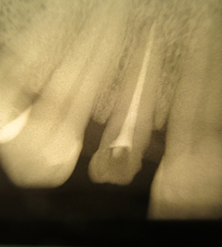 She also exhibits anterior diastemas. The periapical radiograph reveals insufficient endodontic treatment and a periapical lesion (Figure 2).
