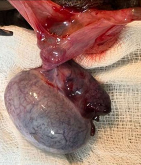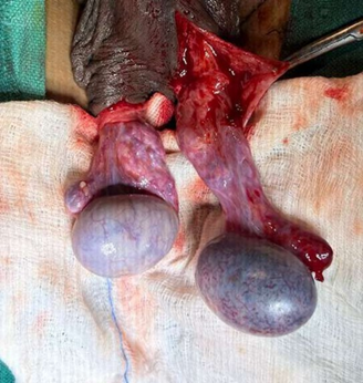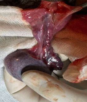 Figure 2: Intraoperative image - congested, enlarged, bluish, and hemorrhagic testis with twisted spermatic cord.