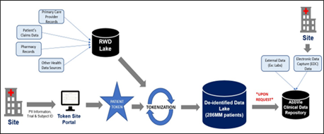 Tokenization starts when the site enters a patient’s Personally Identifiable Information (PII), such as name, birthdate, and zip code, into an external token portal along with the sponsor trial ID and patient ID. This information is used to assign a unique encrypted identifier, otherwise known as a token. For most patients, this token may already be assigned to the individual outside the context of the clinical trial. This data includes sources such as medical and pharmacy bills, insurance claims, and electronic medical records (EMRs). As Real-World Data is collected, it is encrypted by external parties and transferred to a large data lake. Once the token is linked to the sponsor trial ID and patient number, it can be used to locate corresponding RWD records. At any point, the sponsor may request transfer of the encrypted RWD, which can be used to supplement clinical data sources for enhanced analysis. With most encryption processes used, the token has an extremely low risk of being reversed [5].