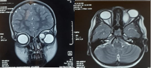 Figure 2: Axial and frontal section of T2 MRI showing the orbital cyst