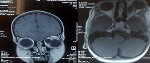 Figure 3: Axial and frontal section of T1 MRI showing the orbital cyst