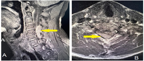 Figure 1: Preoperative MRI of cervical spine T2-weighted image with a hypertense signal in sagittal (A) and axial (B) cuts showing an extradural compression extending from the C4-C6 level as indicated by the yellow arrow.