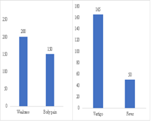 A total of 230 patients were included. The mean age of the patients was 22±14.4 years. Out of 230, the percentage of female was high 156(67.8%) as compared to males 74(32.1%). The sign and symptoms showed most prevalence of Weakness seen in 200(86.9%), followed by vertigo 165 (71.7%) as shown in figure 1. The hematological characteristics of the patients were mentioned in table 1.the Thalassemia minor was diagnosed with the elevated levels of Hemoglobin A2 which has been depicted in table 2.